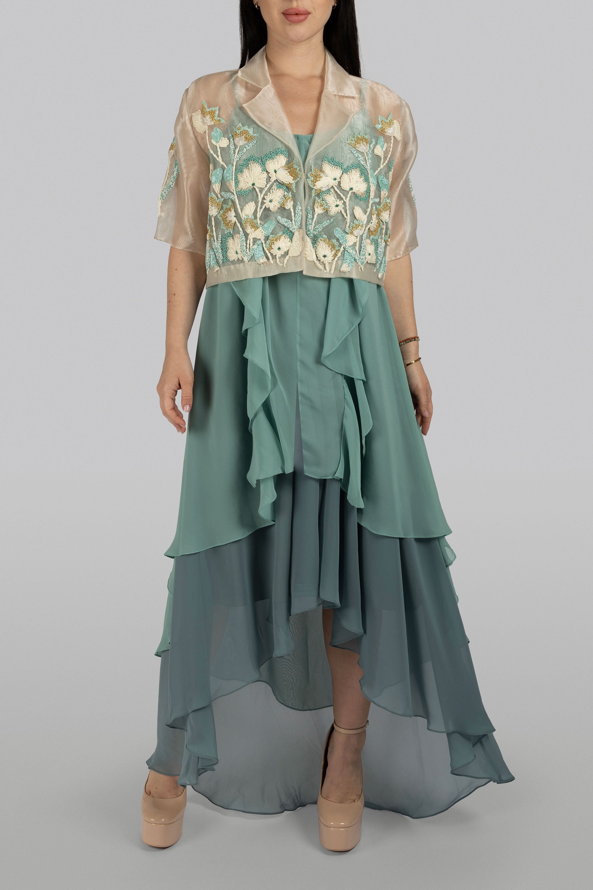 Najmeh grey organza cape jacket with muted gold crystal embroidered collar