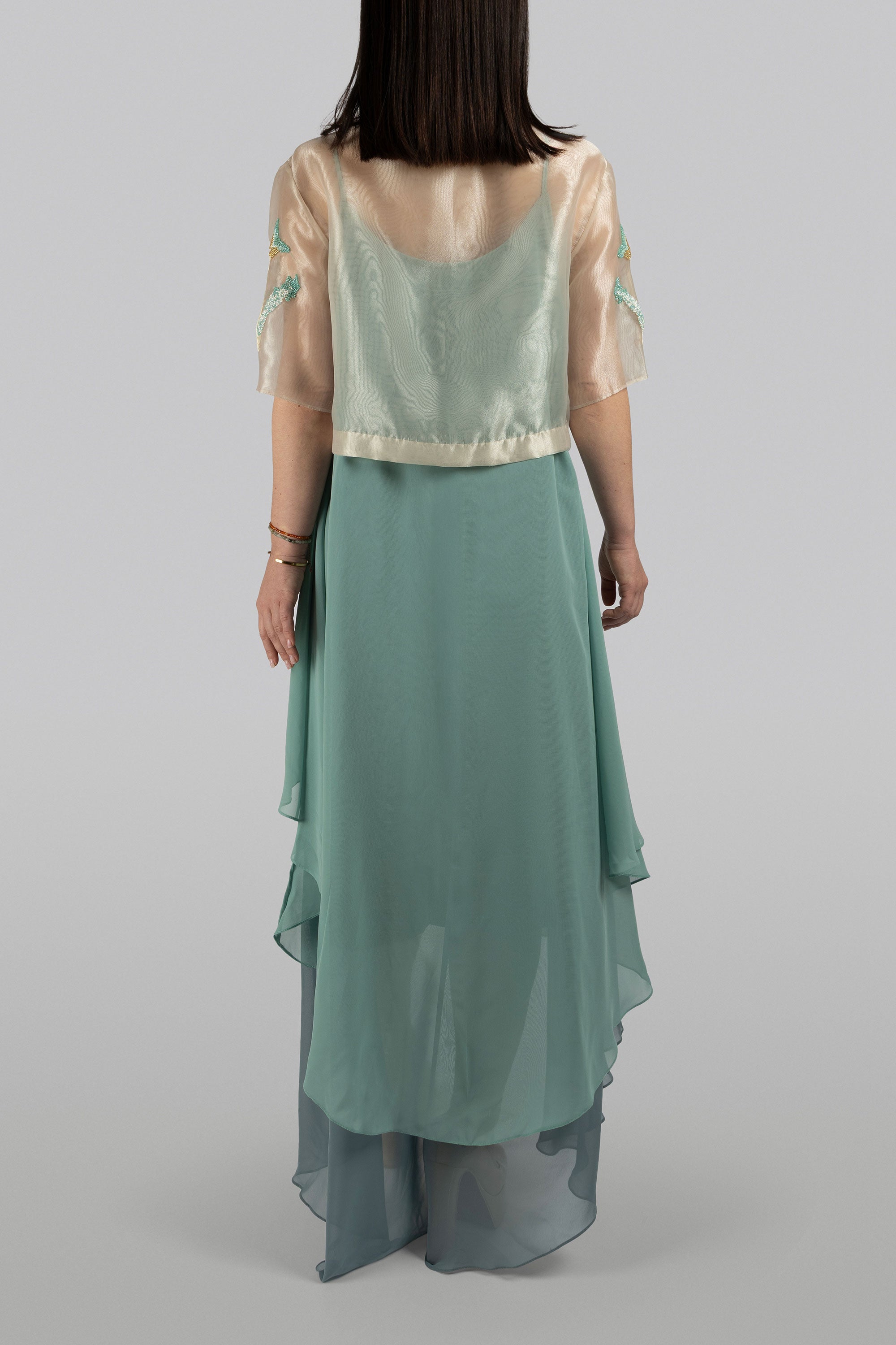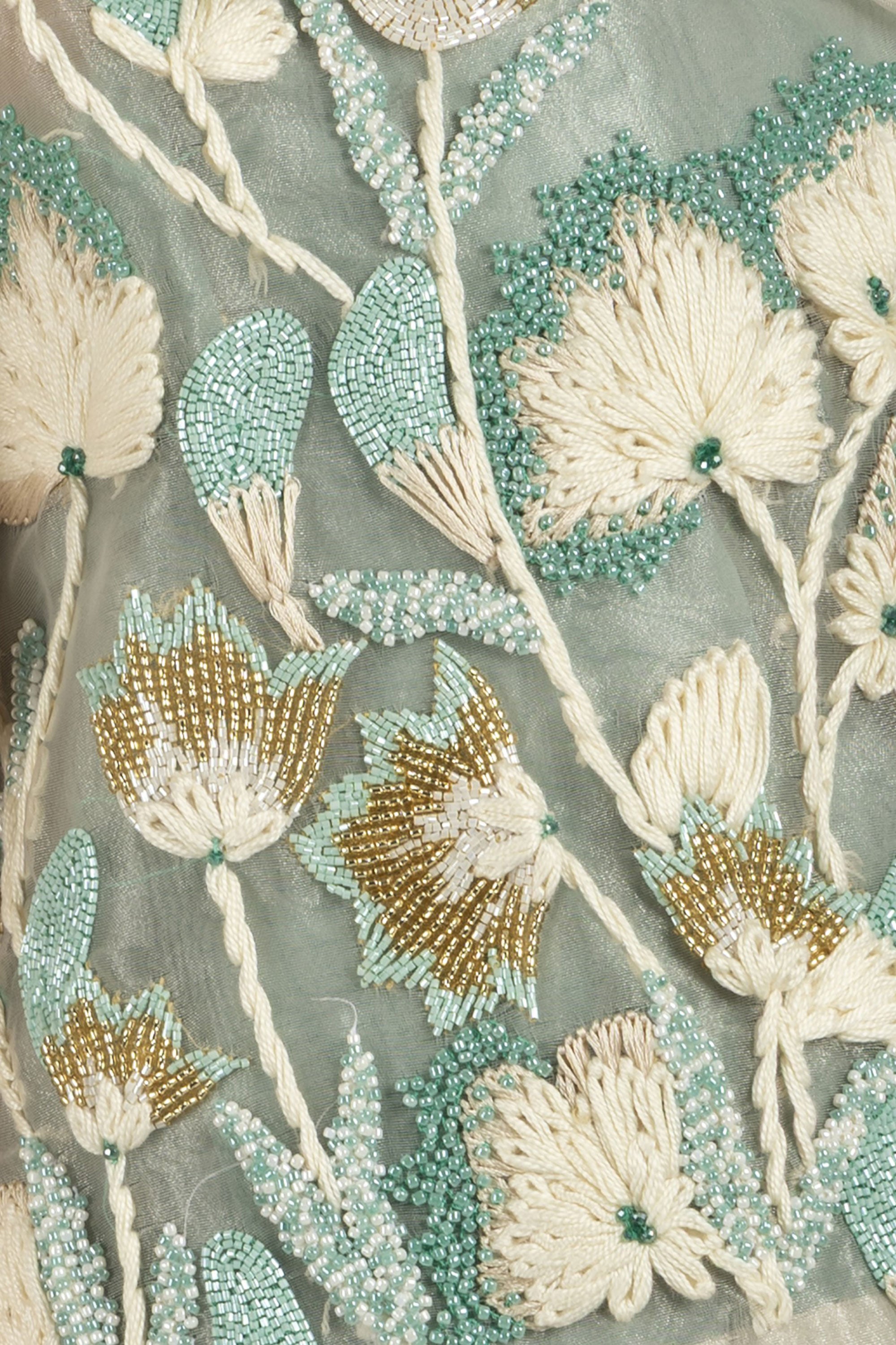 Close-up of antique hand-embroidered beadwork on thalia chiffon cape by KUNST UAE