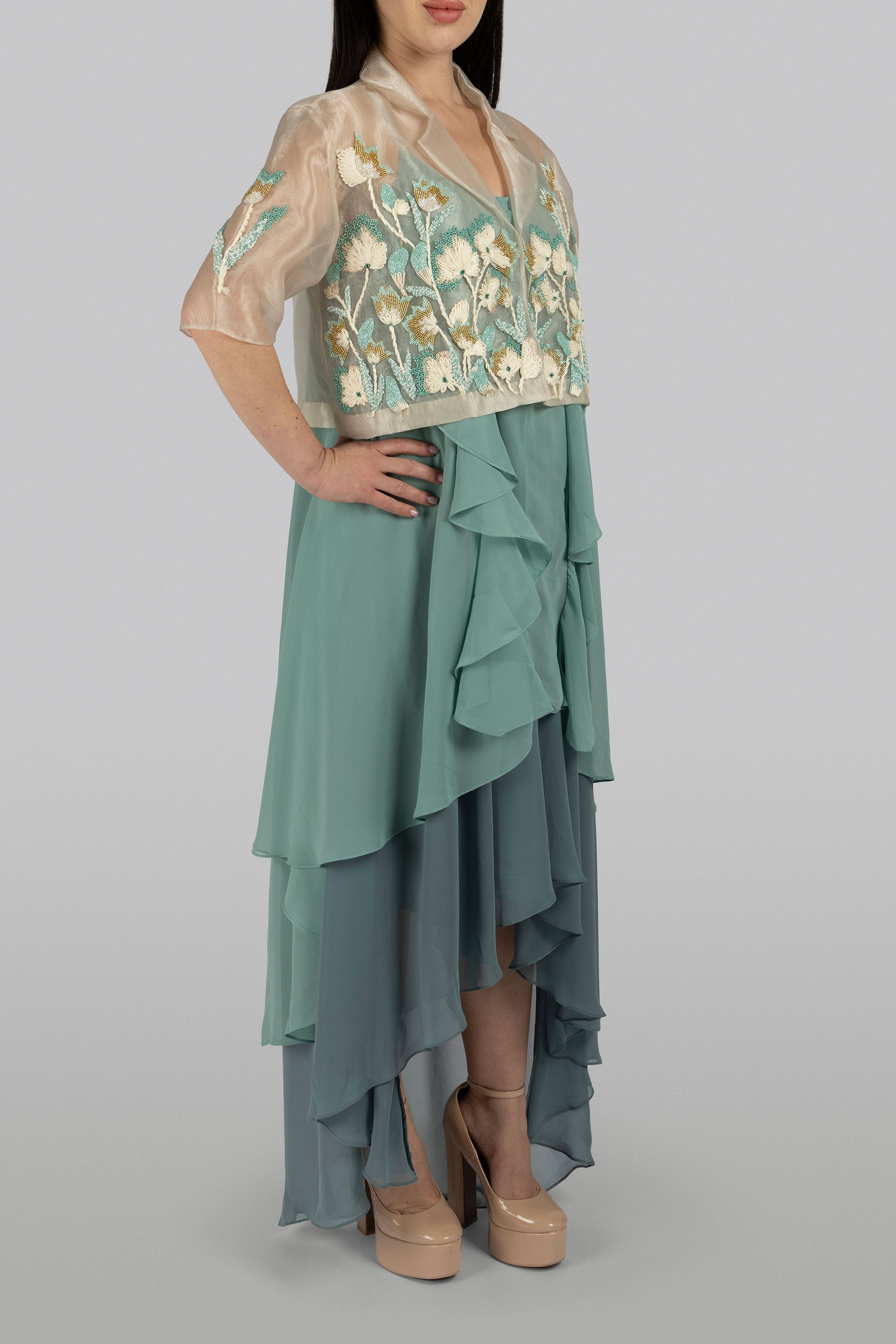 Elara pastel pink organza cape set with flowing ruffles